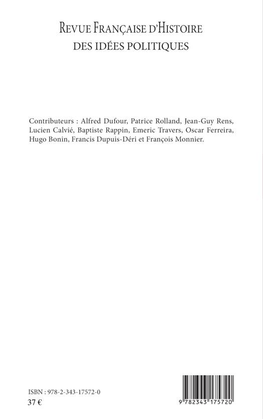 Rousseau et ses Considérations sur le gouvernement de Pologne ou Rousseau historien et législateur antimoderne par Alfred Dufour - Penser la liberté religieuse en 1789 : Stanislas de Clermont-Tonnerre par Patrice Rolland - Pavane pour une révolution heureuse. Aperçu de la pensée politique de Stanislas de Clermont-Tonnerre, 1757-1792 par Jean-Guy Rens - « Le début du siècle nouveau » : le débat intellectuel et politique en Allemagne autour de 1800 par Lucien Calvié - De l’industrialisme saint-simonien aux fondateurs du management scientifique : l’utopie de la coopération par Baptiste Rappin – Complexification sociale et effacement de la souveraineté chez Léon Duguit par Emeric Travers - Quid leges sine moribus ? Jean Massabiau ou l’aporie constitutionnelle du républicanisme au premier XIXe siècle par Oscar Ferreira - Quelle approche pour quelle histoire des idées politiques ? par Hugo Bonin et Francis Dupuis-Déri- Jacques de Cassan par François – Conclusion- Résumés/Abstracts