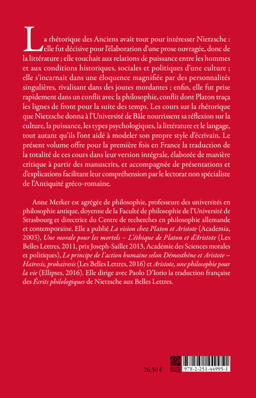 La rhétorique des Anciens avait tout pour intéresser Nietzsche : elle fut décisive pour l’élaboration d’une prose ouvragée, donc de la littérature ; elle touchait aux relations de puissance entre les hommes et aux conditions historiques, sociales et politiques d’une culture ; elle s’incarnait dans une éloquence magnifiée par des personnalités singulières, rivalisant dans des joutes mordantes ; enfin, elle fut prise rapidement dans un conflit avec la philosophie, conflit dont Platon traça les lignes de front pour la suite des temps. Les cours sur la rhétorique que Nietzsche donna à l’Université de Bâle nourrissent sa réflexion sur la culture, la puissance, les types psychologiques, la littérature et le langage, tout autant qu’ils l’ont aidé à modeler son propre style d’écrivain. Le présent volume offre pour la première fois en France la traduction de la totalité de ces cours dans leur version intégrale, élaborée de manière critique à partir des manuscrits, et accompagnée de présentations et d’explications facilitant leur compréhension par le lectorat non spécialiste de l’Antiquité gréco-romaine.