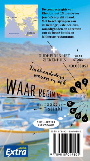 Beleef Rhodos met de compleet vernieuwde reisgids ANWB Extra Rhodos! De veelzijdigheid van Rhodos is voor menig toerist zeer aantrekkelijk. Wie niet komt voor de olijfbomenromantiek of de verlaten stranden kan genieten van het kosmopolitische uitgaansleven met de vele discotheken en winkels.