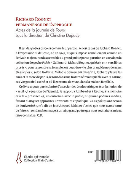 « Je suis la résultante de l’émiettement d’un individu, un ensemble de variations sur le thème de l’être, dont chacune, comme en musique, quitte le thème originel pour le transformer sans le trahir, mais plutôt pour l’accomplir pleinement dans la diversité. » (Richard Rognet.) Il est des poètes discrets comme leur parole : tel est le cas de Richard Rognet, poète contemporain majeur à la délicate écriture, rendu accessible au grand public par sa parution en 2015 dans la collection de poche Poésie/Gallimard. À cette occasion, une journée d’étude lui a été consacrée en 2017 à l’université de Tours, dont ce livre est l’émanation, avec des articles critiques, un entretien et quinze poèmes inédits.