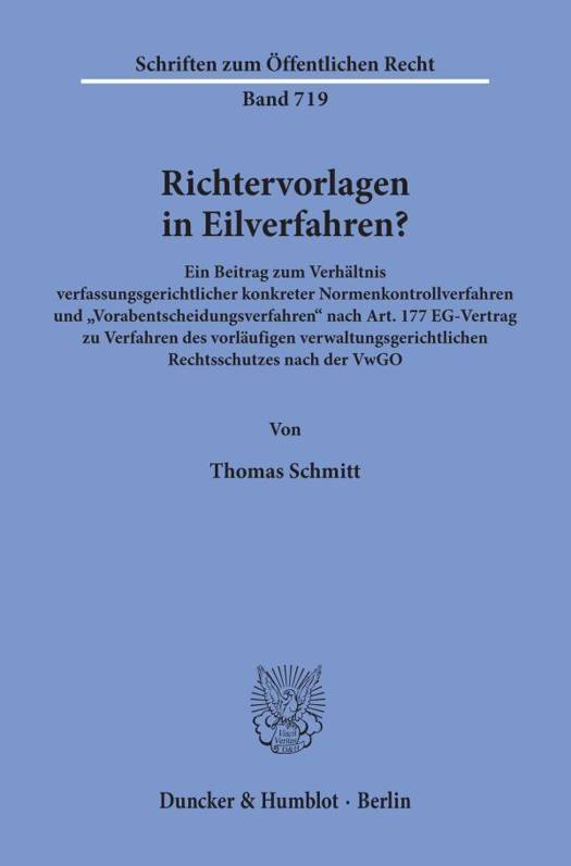 Art. 100 Abs. 1 GG konstituiert eine Aussetzungs- und Vorlagepflicht aller Gerichte, die ein entscheidungserhebliches Gesetz für verfassungswidrig halten. Ähnliches gilt nach Art. 177 EG-Vertrag auch im Europäischen Recht. Zugleich besteht Einigkeit darüber, daß dem Einzelnen gegenüber Akten der öffentlichen Gewalt stets effektiver und damit in Eilfällen auch vorläufiger Rechtsschutz gewährleistet sein muß. Dies zwingt zu der Frage, inwiefern zeitaufwendige "Richtervorlagen" auch in Eilverfahren durchzuführen sind. Die Rechtsansichten hierzu reichen von der Charakterisierung als "Scheinproblem" bzw. einer uneingeschränkten Bejahung bis zur Verneinung jedweder Vorlagepflicht. Die neueste Rechtsprechung des EuGH hat dieser Fragestellung neue Aktualität verliehen. Die vorliegende Arbeit belegt nun, daß entsprechend den jeweiligen Entscheidungsmaßstäben vorläufiger Rechtsschutzverfahren eine Tatbestandserfüllung der Vorlagebestimmungen durchaus möglich ist, dann aber auch von einer Kollision der Vorlagepflichten mit dem Gebot effektiver Rechtsschutzgewährung ausgegangen werden muß. Diese Kollision wird nur durch vorläufige Rechtsschutzgewährung nebst anschließender Vorlage befriedigenden Lösungen zugeführt.