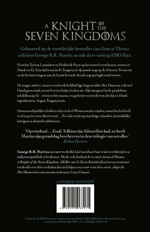 In Ridder van de Zeven Koninkrijken – te zien als A Knight of the Seven Kingdoms op HBO – zijn de eerste drie officiële novelles samengevoegd die voorafgaan aan George R.R. Martins meesterwerk Het Lied van IJs en Vuur, dat eerder meesterlijk werd verfilmd als Game of Thrones. Voordat Tyrion Lannister en Podderik Peyn op het toneel verschenen, waren er Dunk en Ei. Een tijd waarin de Targaryen-dynastie nog op de IJzeren Troon zat en de herinneringen aan de laatst levende draak nog springlevend waren. De jonge, naïeve, maar vooral ook heldhaftige hagenridder ser Duncan de Lange torent boven al zijn rivalen uit. Zijn metgezel is de piepkleine schildknaap Ei – wiens echte naam (een geheim voor iedereen die hij en Dunk tegenkomen) Aegon Targaryen is. Onwaarschijnlijker helden zul je in heel Westeros niet vinden, maar het lot heeft veel in petto voor dit tweetal... zo ook een hoop machtige vijanden, koninklijke intriges en absurde uitbuiters. Met illustraties van meestertekenaar Gary Gianni. 'De echte reden om deze bundel te lezen is dat het gewoonweg een geweldig verhaal is. Martin creëert een levende, ademende wereld op een manier die maar weinig auteurs kunnen...' Tech Times
