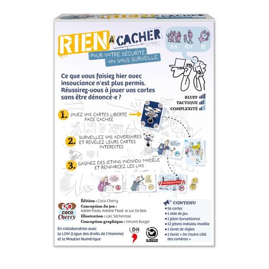 Citoyennes et citoyens, garantir votre sécurité est notre priorité. Nous avons mis en place un programme de surveillance pour détecter et sanctionner toutes les infractions. La grandeur de notre Nation dépend du respect des Législations. Nous comptons sur votre vigilance ! Ce que vous faisiez hier avec insouciance n'est plus permis. Réussirez-vous à jouer vos cartes sans être dénoncé·e ? Rien à cacher est un jeu de bluff pour tout public. 1. Jouez vos cartes Liberté, face cachée 2. Surveillez vos adversaires et révélez leurs cartes interdites 3. Gagnez des jetons Individu modèle et renforcez les lois Le jeu est fabriqué en Europe et illustré par Loïc Sécheresse. Il inclut un livret de 24 pages « De l'autre côté des caméras » rédigé par deux associations qui luttent contre la surveillance de masse et ses dangers pour les libertés : la LDH (Ligue des droits de l'Homme) et le Mouton numérique.