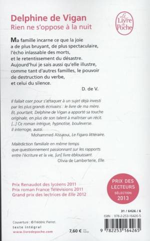 Ma famille incarne ce que la joie a de plus bruyant, de plus spectaculaire, l'écho inlassable des morts, et le retentissement du désastre. Aujourd'hui je sais aussi qu'elle illustre, comme tant d'autres familles, le pouvoir de destruction du verbe, et celui du silence. D. de V.Il fallait oser pour s'attaquer à un sujet déjà investi par les plus grands écrivains: le livre de ma mère. Et, pourtant, D. de Vigan a apporté sa touche originale, en plus de son talent à maîtriser un récit. [...] Ce roman intrigue, hypnotise, bouleverse. Il interroge aussi. Mohammed Aïssaoui, Le Figaro littéraire.Malédiction familiale en mème temps que questionnement passionnant sur les rapports entre l'écriture et la vie, [un] livre éblouissant. Olivia de Lamberterie, Elle.Prix du roman Fnac 2011 - Prix Renaudot des lycéens 2011 - Prix roman France Télévisions 2011 - Grand prix des lectrices de Elle 2012