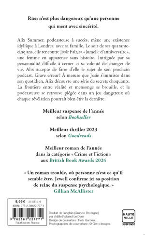 Alix Summer, podcasteuse à succès, mène une existence idyllique à Londres, avec sa famille. Le soir de ses quarante-cinq ans, elle rencontre Josie Fair, sa « jumelle d'anniversaire », une femme en apparence sans histoire. Intriguée par sa personnalité difficile à cerner et sa volonté de changer de vie, Alix accepte de faire d'elle le sujet de son prochain podcast. Grave erreur ! À mesure que Josie s'immisce dans son quotidien, Alix découvre une série de secrets choquants. La frontière entre réalité et mensonge se brouille, et la podcasteuse se retrouve piégée dans un jeu dangereux où chaque révélation pourrait bien être la dernière.