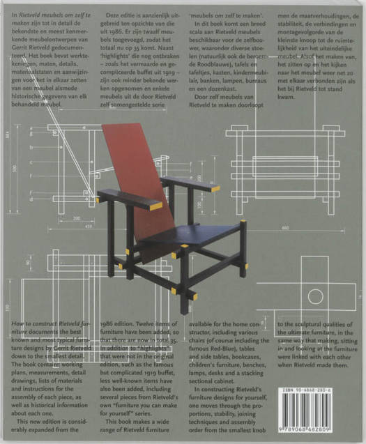 Nederlands- en Engelstalig/Dutch and English text In "Rietveld meubels om zelf te maken" zijn tot in detail de bekendste en meest kenmerkende meubelontwerpen van Gerrit Rietveld gedocumenteerd. Het boek bevat werktekeningen, maten, details, materiaalstaten en aanwijzingen voor het in elkaar zetten alsmede historische gegevens van elk behandeld meubel. Deze editie is aanzienlijk uitgebreid ten opzichte van die uit 1986. Er zijn twaalf meubels toegevoegd, zodat het totaal nu op 35 komt. Naast 'highlights' die nog ontbraken - zoals het vermaarde en gecompliceerde buffet uit 1919 - zijn ook minder bekende werken opgenomen en enkele meubels uit de door Rietveld zelf samengestelde serie 'meubels om zelf te maken'. In dit boek komt een breed scala aan Rietveld meubels beschikbaar voor de zelfbouwer: diverse stoelen (natuurlijk ook de vermaarde Roodblauwe), tafels en tafeltjes, kasten, kindermeubilair, banken, lampen, bureaus en een dozenkast. Door zelf meubels van Rietveld te maken doorloopt men de maatverhoudingen, de stabiliteit, de verbindingen en montagevolgorde van de kleinste knoop tot de ruimtelijkheid van het uiteindelijke meubel. Alsof het maken van, zitten op en kijken naar het meubel weer net zo met elkaar verbonden zijn als het bij Rietveld tot stand kwam. "How to construct Rietveld furniture" documents the best known and most typical furniture designs by Gerrit Rietveld down the smallest detail. The book contains working plans, measurements, detail drawings, lists of materials and instructions for the assembly of each piece, as well as historical information about each one. This new edition is considerably expanded from the 1986 edition. Twelve items of furniture have been added, so that there are now in total 35. In addition to 'highlights' that were not in the original edition, such as the famous but complicated 1919 buffet, less well-known items have also been added, including several pieces from Rietveld's own 'furniture you can make yourself' series. This book makes a wide range of Rietveld furniture available for the home constructor, including various chairs (of course including the famous Red-Blue), tables and side tables, bookcases, children's furniture, benches, lamps, desks and a stacking sectional cabinet. In constructing Rietveld's furniture designs for yourself, one moves through the proportions, stability, joining techniques and assembly order from the smallest knob to the sculptural qualities of the ultimate furniture, in the same way that making, sitting in and looking at furniture were linked with each other when Rietveld made them.