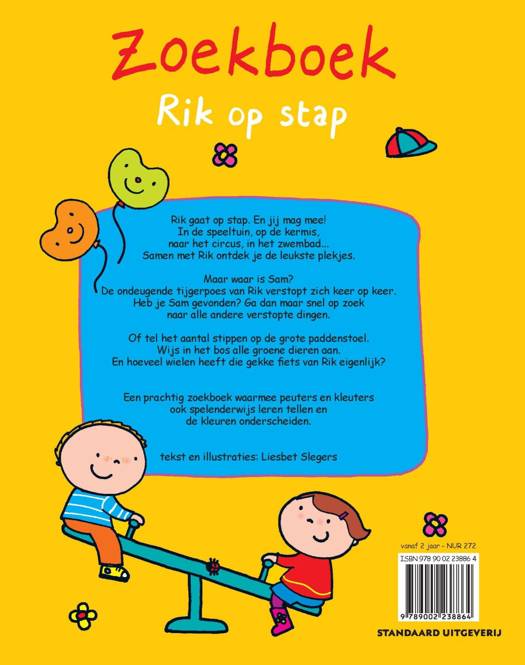 In het zoekboek Rik gaat op stap staan opnieuw een heleboel rijk gevulde kijkplaten. En Rik gaat waar alle kinderen graag gaan: hij doet inkopen bij de bakker en in de supermarkt, beleeft dolle pret op de kermis, woont een circusvoorstelling bij, gaat kamperen in het bos en nog veel meer. Bij elke plaat staan eenvoudige zoekopdrachten die jonge kinderen urenlang zullen bezighouden!