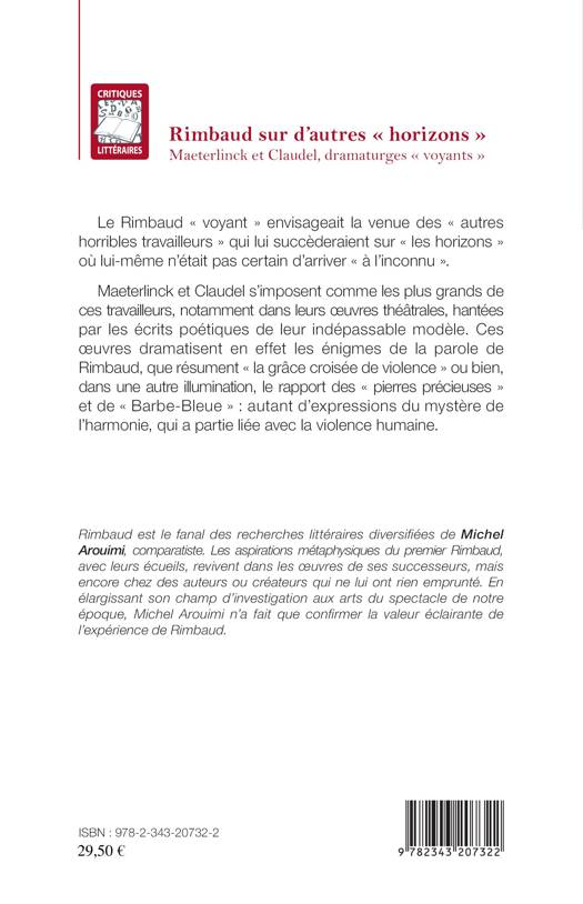 Le Rimbaud « voyant » envisageait la venue des « autres, horribles travailleurs » qui lui succèderaient sur « les horizons » où lui-même n'était pas certain d'arriver « à l'inconnu ». Maeterlinck et Claudel s'imposent comme les plus grands de ces travailleurs, notamment dans leurs oeuvres théâtrales, hantées par les écrits poétiques de leur indépassable modèle. Ces oeuvres dramatisent en effet les énigmes de la parole de Rimbaud, que résument « la grâce croisée de violence » ou bien, dans une autre illumination, le rapport des « pierres précieuses » et de « Barbe-Bleue » : autant d'expressions du mystère de l'harmonie, qui a partie liée avec la violence humaine.
