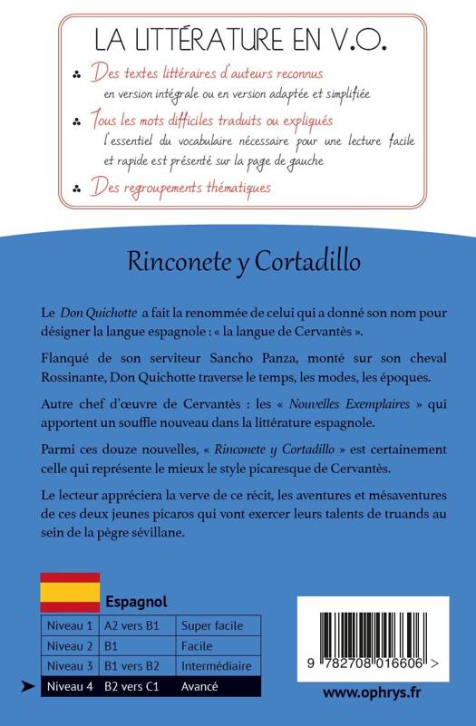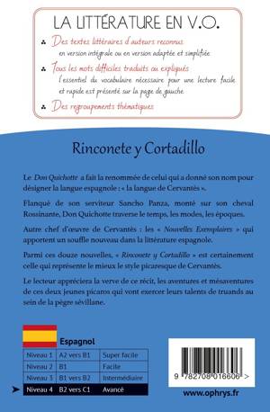 Après Don Quichotte, Rinconete y Cortadillo est l’une des nouvelles les plus connues de Miguel de Cervantes, tirée de Nouvelles Exemplaires paru en 1613. Elle met en scène deux jeunes garçons, Pedro del Rincon et Diego Cortado. L'un est voleur, l'autre escroc. Après leur rencontre dans une taverne, chacun reconnaît très vite en l'autre son alter ego. Ils deviennent amis et décident de faire équipe. Le lecteur appréciera la verve de ce récit, les aventures et mésaventures de ces deux jeunes voyous qui vont exercer leurs talents de truands au sein de la pègre sévillane dirigée par le très respecté Monipodio. La collection "Histoires faciles à lire" s'adresse à tous ceux qui ont envie de lire des textes littéraires en version originale. Les textes sont présentés en version intégrale ou en version adaptée et simplifiée. L'essentiel du vocabulaire nécessaire est traduit sur la page de gauche pour une lecture facile, rapide et autonome. Chaque histoire est accompagnée d'un court appareil pédagogique à utiliser en classe ou en autonomie.