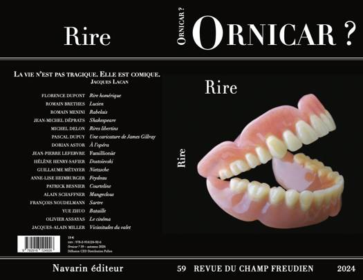 « La vie n’est pas tragique. Elle est comique. » Cette proposition de Lacan, destinée à décoller chacun du pathos qu’il associe aux drames de sa vie, a ouvert la voie d’« Ornicar ? » 59 dédié au rire. Telle serait une conclusion que chaque analysant peut tirer de l’expérience analytique, allégé de quelques drames qui ont trouvé à s’exprimer, s’éclairer, se répéter jusqu’à s’user, pour enfin s’effacer. Les larmes ayant valeur d’éternité s’assèchent. Le passé se fait moins douloureux, intégré à l’histoire. Un ciel d’orage laisse place enfin à l’éclair du « Witz » (mot d’esprit) ou à un éclat de rire. Lacan époussette la tradition comme l’allure funèbre. Pourquoi Freud a-t-il eu recours à la tragédie fondatrice d’Œdipe pour donner ses assises à la psychanalyse ? Le fond n’est-il pas plutôt tissé de la comédie des sexes, synthétisable dans la destinée du phallus bouffon, érigé pour toujours retomber ? Qu’est-ce qui fait rire, amuse, provoque ce mouvement irrépressible, contingent, bizarre, qui lui-même procure du plaisir, mais peut aussi signer la gêne ? Du plaisir du jeu de mots à l’effet de poésie, les auteurs de ce numéro ont mis le rire à l’épreuve de l’écriture, à travers le temps, la littérature, l’opéra, la caricature, la philosophie, le cinéma ou encore le théâtre.
