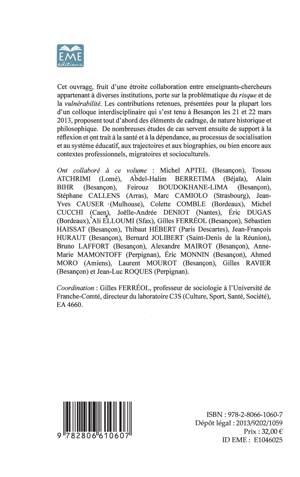 Cet ouvrage, fruit d'une étroite collaboration entre enseignants-chercheurs appartenant à diverses institutions, porte sur la problématique du risque et de la vulnérabilité. Les contributions retenues, présentées pour la plupart lors d'un colloque interdisciplinaire qui s'est tenu à Besançon les 21 et 22 mars 2013, proposent tout d'abord des éléments de cadrage, de nature historique et philosophique. De nombreuses études de cas servent ensuite de support à la réflexion et ont trait à la santé et à la dépendance...