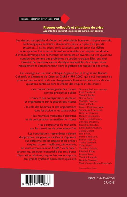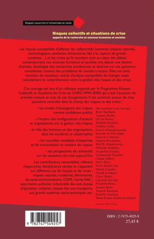 Les risques susceptibles d'affecter les collectivités humaines (risques naturels, technologiques, sanitaires, alimentaires, liés à la rupture de grands systèmes...) et les crises qu'ils suscitent sont au coeur des débats contemporains. Les sciences humaines et sociales ont, depuis une dizaine d'années, développé des recherches nombreuses et diverses sur ces questions considérées comme des problèmes de société cruciaux. Elles ont ainsi introduit de nouveaux cadres d'analyse susceptibles de changer assez radicalement la compréhension voire la gestion des risques et des crises.