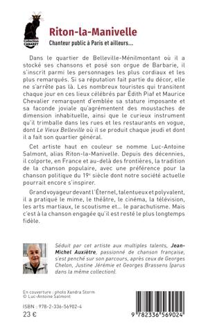 Dans le quartier de Belleville-Ménilmontant où il a stocké ses chansons et posé son orgue de Barbarie, il s'inscrit parmi les personnages les plus cordiaux et les plus remarqués. Si sa réputation fait partie du décor, elle ne s'arrête pas là. Les nombreux touristes qui transitent chaque jour en ces lieux célébrés par Édith Piaf et Maurice Chevalier remarquent d'emblée sa stature imposante et sa faconde joviale qu'agrémentent des moustaches de dimension inhabituelle, ainsi que le curieux instrument qu'il trimballe dans les rues et les restaurants en vogue, dont Le Vieux Belleville où il se produit chaque jeudi et dont il a fait son quartier général. Cet artiste haut en couleur se nomme Antoine-Luc Salmont, alias Riton-la-Manivelle. Depuis des décennies, il colporte, en France et au-delà des frontières, la tradition de la chanson populaire, avec une préférence pour la chanson politique du 19e siècle dont notre société actuelle pourrait encore s'inspirer. Grand voyageur devant l'Éternel, talentueux et polyvalent, il a pratiqué le mime, le théâtre, le cinéma, la télévision, les arts martiaux, le scoutisme et... le parachutisme. Mais c'est à la chanson engagée qu'il est resté le plus longtemps fidèle.