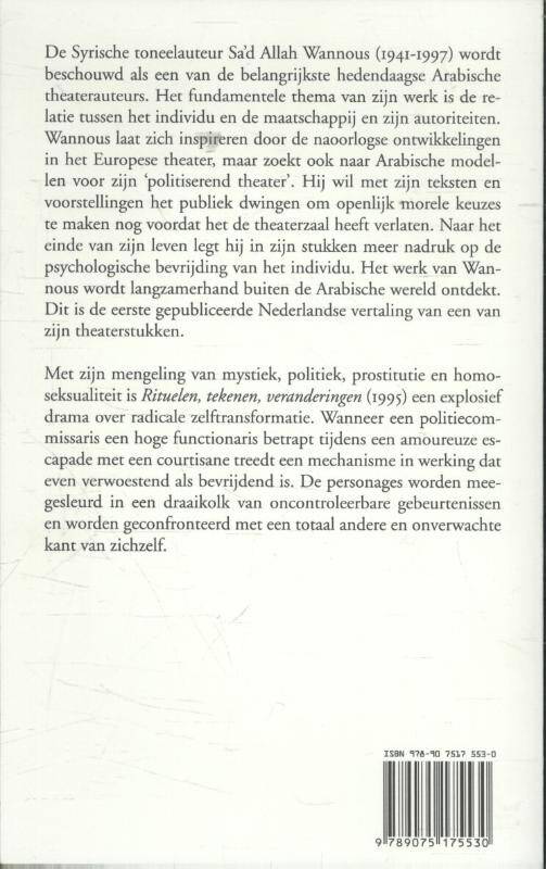 De Syrische toneelauteur Sa’d Allah Wannous (1941-1997) wordt beschouwd als een van de belangrijkste hedendaagse Arabische theaterauteurs. Het fundamentele thema van zijn werk is de relatie tussen het individu en de maatschappij en zijn autoriteiten. Wannous laat zich inspireren door de naoorlogse ontwikkelingen in het Europese theater, maar zoekt ook naar Arabische modellen voor zijn ‘politiserend theater’. Hij wil met zijn teksten en voorstellingen het publiek dwingen om openlijk morele keuzes te maken nog voordat het de theaterzaal heeft verlaten. Naar het einde van zijn leven legt hij in zijn stukken meer nadruk op de psychologische bevrijding van het individu. Het werk van Wannous wordt langzamerhand buiten de Arabische wereld ontdekt. Dit is de eerste gepubliceerde Nederlandse vertaling van een van zijn theaterstukken. Met zijn mengeling van mystiek, politiek, prostitutie en homoseksualiteit is Rituelen, tekenen, veranderingen (1995) een explosief drama over radicale zelftransformatie. Wanneer een politiecommissaris een hoge functionaris betrapt tijdens een amoureuze escapade met een courtisane treedt een mechanisme in werking dat even verwoestend als bevrijdend is. De personages worden meegesleurd in een draaikolk van oncontroleerbare gebeurtenissen en worden geconfronteerd met een totaal andere en onverwachte kant van zichzelf.