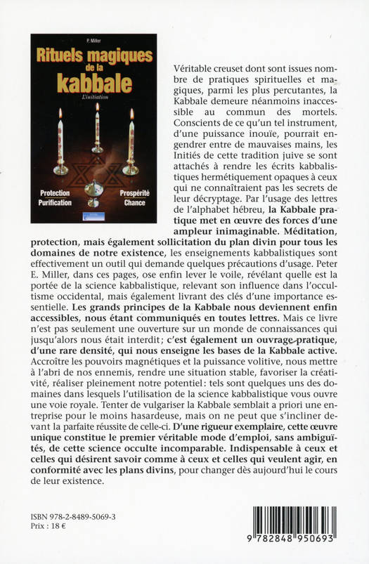 Véritable creuset dont sont issues nombre de pratiques spirituelles et magiques, parmi les plus percutantes, la Kabbale demeure néanmoins inaccessible au commun des mortels. Conscients de ce qu'un tel instrument, d'une puissance inouïe, pourrait engendrer entre de mauvaises mains, les Initiés de cette tradition juive se sont attachés à rendre les écrits kabbalistiques hermétiquement opaques à ceux qui ne connaîtraient pas les secrets de leur décryptage. Par l'usage des lettres de l'alphabet hébreu, la Kabbale pratique met en oeuvre des forces d'une ampleur inimaginable. Méditation, protection, mais également sollicitation du plan divin pour tous les domaines de notre existence, les enseignements kabbalistiques sont effectivement un outil qui demande quelques précautions d'usage. Peter E Miller, dans ces pages, ose enfin lever le voile, révélant quelle est la portée de la science kabbalistique, relevant son influence dans l'occultisme occidental, mais également livrant des clés d'une importance essentielle. Les grands principes de la Kabbale nous deviennent enfin accessibles, nous étant communiqués en toutes lettres. Mais ce livre n'est pas seulement une ouverture sur un monde de connaissances qui jusqu'alors nous était interdit ; c'est également un ouvrage pratique, d'une rare densité, qui nous enseigne les bases de la Kabbale active. Accroître les pouvoirs magnétiques et la puissance volitive, nous mettre à l'abri de nos ennemis, rendre une situation stable, favoriser la créativité, réaliser pleinement notre potentiel : tels sont quelques-uns des domaines dans lesquels l'utilisation de la science kabbalistique vous ouvre une voie royale. Tenter de vulgariser la Kabbale semblait a priori une entreprise pour le moins hasardeuse, mais on ne peut que s'incliner devant la parfaite réussite de celle-ci. D'une rigueur exemplaire, cette oeuvre unique constitue le premier véritable mode d'emploi, sans ambiguïtés, de cette science occulte incomparable. Indispensable à ceux et celles qui désirent savoir comme à ceux et celles qui veulent agir, en conformité avec les plans divins, pour changer dès aujourd'hui le cours de leur existence.