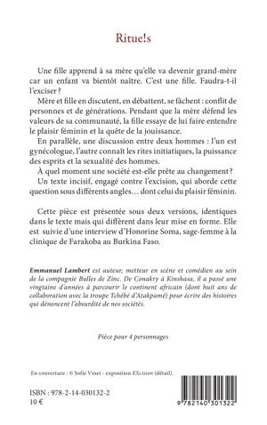 Une fille apprend à sa mère qu'elle va devenir grand-mère car un enfant va bientôt naître. C'est une fille. Faudra-t-il l'exciser ? Mère et fille en discutent, en débattent, se fâchent: conflit de personnes et de générations. Pendant que la mère défend les valeurs de sa communauté, la fille essaye de lui faire entendre le plaisir féminin et la quête de la jouissance. En parallèle, une discussion entre deux hommes: l'un est gynécologue, l'autre connaît les rites initiatiques, la puissance des esprits et la sexualité des hommes. À quel moment une société est-elle prête au changement ? Un texte incisif, engagé contre l'excision, qui aborde cette question sous différents angles... dont celui du plaisir féminin. Cette pièce est présentée sous deux versions, identiques dans le texte mais qui diffèrent dans leur mise en forme. Elle est suivie d'une interview d'Honorine Soma, sage-femme à la clinique de Farakoba au Burkina Faso.