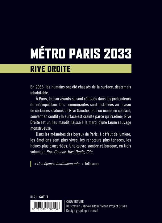 À Paris, les survivants se sont réfugiés dans les profondeurs du métropolitain. Des communautés sont installées au niveau de certaines stations de Rive Gauche, plus ou moins en contact, souvent en conflit ; la surface est crainte parce qu’irradiée ; Rive Droite est un lieu maudit, laissé à la merci d’une faune sauvage monstrueuse.