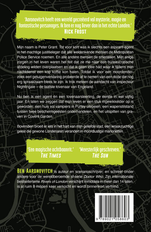 Mijn naam is Peter Grant. Ik zat ooit in mijn proeftijd als agent in het machtige justitieleger dat alle weldenkende mensen de Metropolitan Police Service noemen. En alle andere mensen De smeris… Mijn verhaal begint wanneer ik een ooggetuigenverklaring probeerde af te nemen van een man die al dood was…