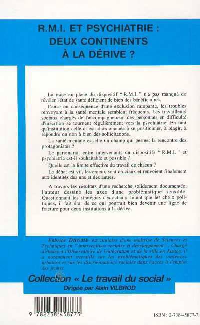 La mise en place du dispositif " R.M.I. " n'a pas manqué de révéler l'état de santé déficient de bien des bénéficiaires. Cause ou conséquence d'une exclusion rampante, les troubles renvoyant à la santé mentale semblent fréquents. Les travailleurs sociaux chargés de l'accompagnement des personnes en difficulté d'insertion se tournent régulièrement vers la psychiatrie. En tant qu'institution celle-ci est alors amenée à se positionner, à réagir, à répondre ou non à bien des sollicitations. La santé mentale est-elle un champ qui permet la rencontre des protagonistes ? Le partenariat entre intervenants du dispositif " R.M.I. " et psychiatrie est-il souhaitable et possible ?