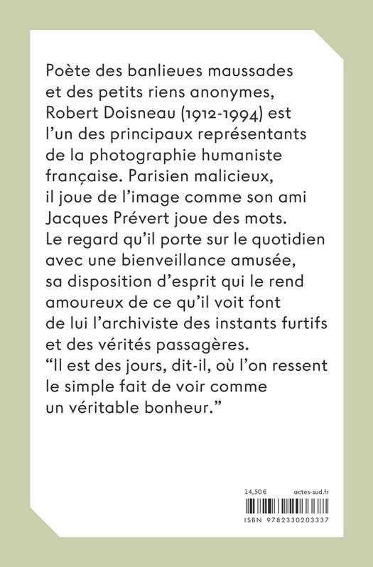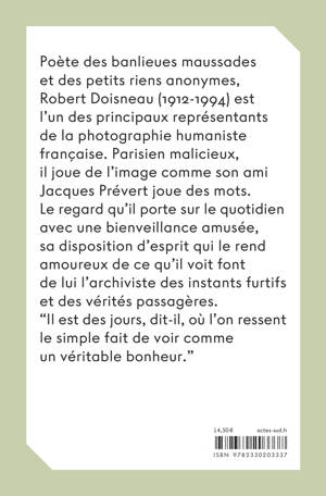 Poète des banlieues maussades et des petits riens anonymes, Robert Doisneau (1912-1994) est l'un des principaux représentants de la photographie humaniste française. Parisien malicieux, il joue de la photographie comme son ami Jacques Prévert jouait des mots. Le regard qu'il porte sur le quotidien avec une bienveillance amusée, sa disposition d'esprit qui le rend amoureux de ce qu'il voit font de lui l'archiviste des instants furtifs et des vérités passagères. "Il est des jours, dit-il, où l'on ressent le simple fait de voir comme un véritable bonheur."