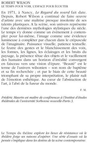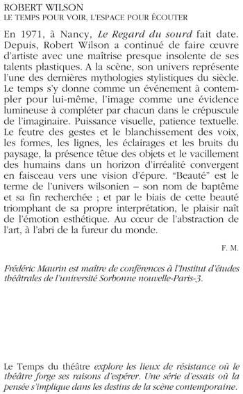 En 1971, à Nancy, Le Regard du sourd fait date. Depuis, Robert Wilson a continué de faire oeuvre d'artiste avec une maîtrise presque insolente de ses talents plastiques. A la scène, son univers représente l'une des dernières mythologies stylistiques du siècle. Le temps s'y donne comme un événement à contem - pler pour lui-même, l'image comme une évidence lumineuse à compléter par chacun dans le crépuscule de l'imaginaire. Puissance visuelle, patience textuelle. Le feutre des gestes et le blanchis sement des voix, les formes, les lignes, les éclairages et les bruits du paysage, la présence têtue des objets et le vacil lement des humains dans un horizon d'irréa lité convergent en faisceau vers une vision d'épure. "Beauté" est le terme de l'univers wilsonien - son nom de baptême et sa fin recherchée ; et par le biais de cette beauté triomphant de sa propre interpré tation, le plaisir naît de l'émotion esthé tique. Au coeur de l'abstraction de l'art, à l'abri de la fureur du monde.