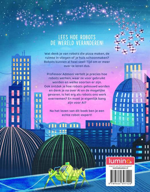 Lees hoe robots de wereld veranderen! Wat denk je van robots die pizza maken, de ruimte in vliegen of je huis schoonmaken? Robots kunnen al heel veel! Tijd om er meer over te leren dus. Professor Admoni vertelt je precies hoe robots werken, waar ze voor gebruikt worden en welke soorten er zijn. Ook ontdek je hoe robots gebouwd worden en denk je na over AI en de mogelijke gevaren. Is het erg als robots ons werk overnemen? En moet je eigenlijk bang zijn voor AI? Na het lezen van dit boek ben je een echte robot-expert!