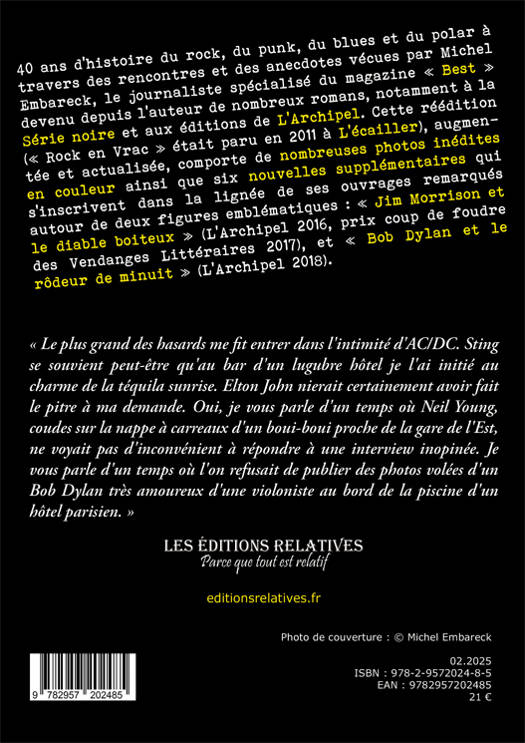 40 ans d'histoire du rock, du punk, du blues et du polar à travers des rencontres et des anecdotes vécues par Michel Embareck, le journaliste spécialisé du magazine « Best » devenu depuis l'auteur de nombreux romans, notamment à la Série noire et aux éditions de L'Archipel. Cette réédition, augmentée et actualisée, comporte de nombreuses photos inédites en couleur ainsi que six nouvelles supplémentaires qui s'inscrivent dans la lignée de ses ouvrages remarqués autour de deux figures emblématiques : « Jim Morrison et le diable boiteux » et « Bob Dylan et le rôdeur de minuit ».