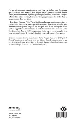 "Je me suis demandé à quoi tient ce goût bien particulier, cette fascination que nous avons pour les récits dans lesquels les protagonistes s'égarent, fuient, errent, tournent en rond, repartent, pour se perdre encore et toujours. D'Ulysse à Pinocchio, même combat, le road movie zigzague depuis des siècles dans la nature comme dans nos têtes." Les Rococo Notes de Fabio Viscogliosi fourmillent de questions concrètes et existentielles, lorsque la pensée prend la tangente, digresse et rebondit pour retomber sur ses pattes, toujours un peu plus loin. Elles témoignent avant tout de l'appétit d'un auteur touche-à-tout et curieux de mille nuances. Claire Bretécher, Jean Renoir, Sei Shōnagon, Saul Steinberg ou son propre père sont ainsi convoqués au gré de ces pérégrinations à travers le temps et les espaces.
