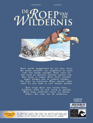 Buck wordt weggehaald bij zijn fijne thuis. Hij wordt verkocht als sledehond en moet naar het koude noorden. Daar leert hij hoe hard en gemeen mensen kunnen zijn. Het leven is zwaar. Buck moet vechten tegen honger, kou en andere honden. Hij leert te overleven. Maar steeds vaker voelt hij iets ouds in zich wakker worden. Dan krijgt Buck een nieuwe baas. Eindelijk voelt hij zich veilig en geliefd. Maar diep vanbinnen hoort hij steeds luider... De roep van de wildernis...