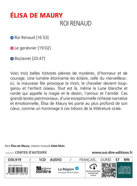 Voici trois belles histoires pleines de mystères, d'amour, d'honneur et de courage. De Bisclaveret, chevalier respecté en son royaume mais homme-loup à chaque pleine lune, au roi Renaud d'Henri Pourrat, à l'étrange conte du genévrier des Frères Grimm, ces grands textes patrimoniaux sont portés au plus profond de son coeur par une conteuse de talent. D'une exceptionnelle richesse narrative et émotionnelle, voilà une belle façon de découvrir ces trésors de la littérature orale.