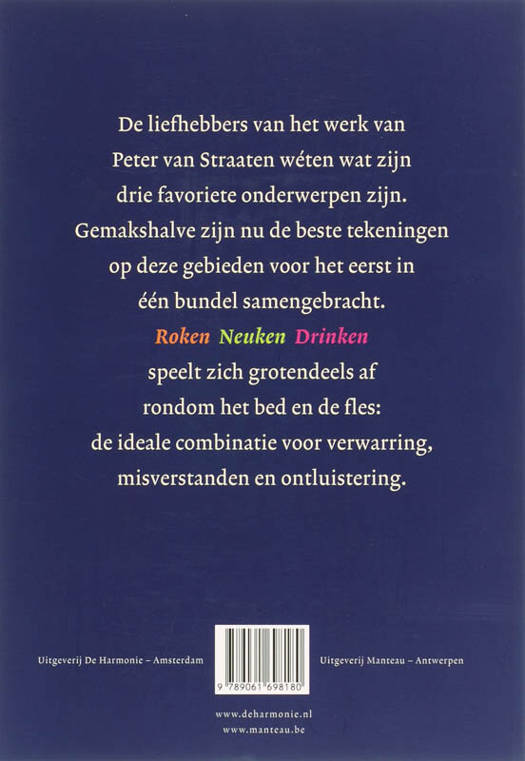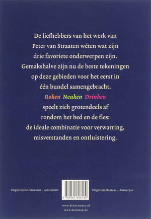 De liefhebbers van het werk van Peter van Straaten w n wat zijn drie favoriete onderwerpen zijn. Gemakshalve zijn nu de beste tekeningen op deze gebieden voor het eerst in bundel samengebracht. Roken Neuken Drinken spelt zich grotendeels af rondom het bed en de fles: de ideale combinatie voor verwarring, misverstanden en ontluistering.