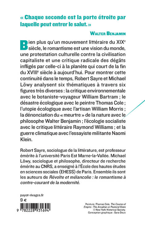 Bien plus qu'un mouvement littéraire du XIXe siècle, le romantisme est une vision du monde, une protestation culturelle contre la civilisation capitaliste et une critique radicale des dégâts infligés par celle-ci à la planète qui court de la fin du XVIIIe siècle à aujourd'hui. Pour montrer cette continuité dans le temps, Robert Sayre et Michael Löwy analysent six thématiques à travers six figures très diverses : la critique environnementale avec le botaniste-voyageur William Bartram ; le désastre écologique avec le peintre Thomas Cole ; l'utopie écologique avec l'artisan William Morris ; la dénonciation du "meurtre" de la nature avec le philosophe Walter Benjamin ; l'écologie socialiste avec le critique littéraire Raymond Williams ; et la guerre climatique avec l'essayiste militante Naomi Klein.