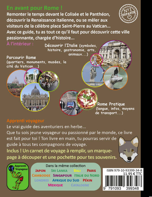 En avant pour Rome ! Le vrai guide des aventuriers en herbe ! Remonter le temps devant le Colisée et le Panthéon, découvrir la Renaissance italienne, ou se mêler aux visiteurs de la célèbre place Saint-Pierre au Vatican... Destiné aux jeunes, voyageurs ou passionnés par le monde, ce livre contient tout ce qu’il faut pour appréhender cette ville passionnante, chargée d’histoire, et servir de guide à tous ses compagnons de voyage. Contenu : Une section pour découvrir l’Italie et ses habitants : géographie, histoire, culture, mode vie, arts, gastronomie, sports, faune et flore... Une section de visite de Rome par thèmes : quartiers, monuments, musées, la cité du Vatican... Une section pratique : moyens de transport, infos pratiques, conseils, langues. Les petits plus : une mise en page attractive (colorée, textes courts, nombreuses photos et illustrations), une section pour décrire ses expériences de voyage, une pochette pour conserver ses souvenirs, un marque-page à découper.