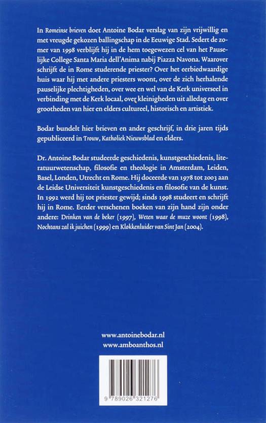 In Romeinse brieven doet Antoine Bodar verslag van zijn vrijwillig en met vreugde gekozen ballingschap in de Eeuwige Stad. Sedert de zomer van 1998 verblijft hij in de hem toegewezen cel van het Pauselijke College Santa Maria dellAnima nabij Piazza Navona. Waarover schrijft de in Rome studerende priester? Over het eerbiedwaardige huis waar hij met andere priesters woont, over de zich herhalende pauselijke plechtigheden, over wee en wel van de Kerk universeel in verbinding met de Kerk locaal, over kleinigheden uit alledag en over grootheden van hier en elders cultureel, historisch en artistiek.