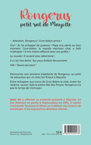 - Attention, Rongerus ! Gros-bidon arrive ! Ouf ! Je l'ai échappé de justesse ! Papa m'a alerté au bon moment. Gros-bidon, le maudit méchant chat, a failli m'attraper ! Il m'a même effleuré avec ses griffes ! Le revoilà ! Il revient plus déterminé !Il a l'air très fâché. Ses yeux brillent férocement. Vite ! Sauve qui peut ! Découvrez une semaine trépidante de Rongerus, un petit rat astucieux qui vit chez les Poiyot à Mayotte. Entre échapper aux crocs de Gros-Bidon le chat, éviter les ratières, sauver Ayla la petite fille des Poiyot, Rongerus n'a pas le temps de s'ennuyer.