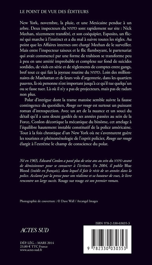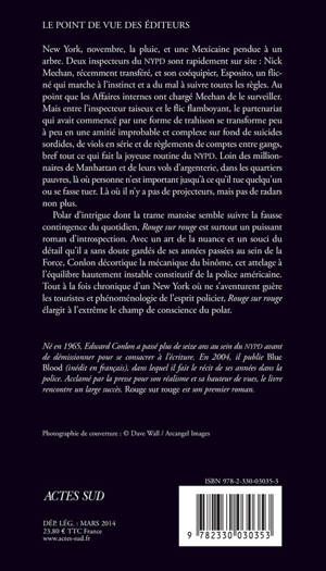 Polar d'intrigue dont la trame matoise semble suivre la fausse contingence du quotidien, «Rouge sur rouge» est surtout un puissant roman d'introspection. Avec un art de la nuance et un souci du détail qu'il a sans doute gardés de ses années passées au sein de la Force, Conlon décortique la mécanique du binôme, cet attelage à l'équilibre hautement instable constitutif de la police américaine. Tout à la fois chronique d'un New York où ne s'aventurent guère les touristes et phénoménologie de l'esprit policier, «Rouge sur rouge» élargit à l'extrême le champ de conscience du polar.