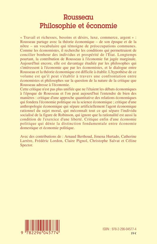 Longtemps, la contribution de Rousseau à l'économie fut jugée marginale, davantage étudiée par les philosophes que par les économistes. L'ambition de ce volume est d'établir un dialogue entre Rousseau et la théorie économique, à travers une confrontation entre économistes et philosophes sur la question de la nature de la critique que Rousseau adresse à l'économie.