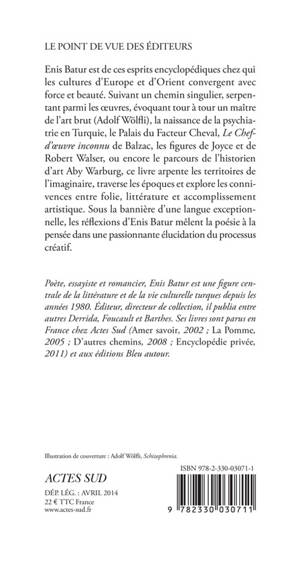 Enis Batur est de ces esprits encyclopédiques chez qui les cultures d'Europe et d'Orient convergent avec force et beauté. Suivant un chemin singulier, serpentant parmi les oeuvres, évoquant tour à tour un maître de l'art brut (Adolf Wölfli), la naissance de la psychiatrie en Turquie, le Palais du Facteur Cheval, «Le Chefd'oeuvre inconnu» de Balzac, les figures de Joyce et de Robert Walser, ou encore le parcours de l'historien d'art Aby Warburg, ce livre arpente les territoires de l'imaginaire, traverse les époques et explore les connivences entre folie, littérature et accomplissement artistique. Sous la bannière d'une langue exceptionnelle, les réflexions d'Enis Batur mêlent la poésie à la pensée dans une passionnante élucidation du processus créatif.