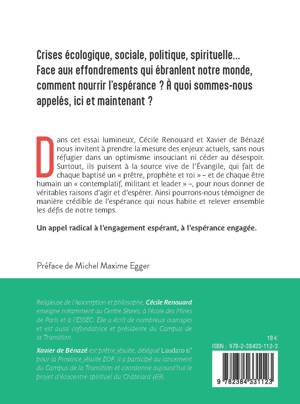 Crises écologique, sociale, politique, spirituelle… Dans cet essai lumineux, Cécile Renouard et Xavier de Bénazé nous invitent à prendre la mesure des enjeux actuels, sans nous réfugier dans un optimisme insouciant ni céder au désespoir. Surtout, ils puisent à la source vive de l’Évangile, qui fait de chaque baptisé un « prêtre, prophète et roi » – et de chaque être humain un « contemplatif, militant et leader » –, pour nous donner de véritables raisons d’agir et d’espérer. Ainsi pourrons-nous témoigner de manière crédible de l’espérance qui nous habite et relever ensemble les défis de notre temps. Un appel radical à l’engagement espérant, à l’espérance engagée.