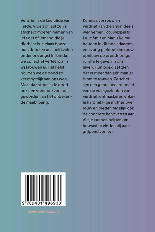 Verdriet is de keerzijde van liefde. Vroeg of laat zul je afscheid moeten nemen van iets dat of iemand die je dierbaar is. Helaas boezemen dood en afscheid velen onder ons angst in, omdat we collectief verleerd zijn wat rouwen is. Het liefst houden we de dood zo ver mogelijk van ons weg. Maar daardoor is de dood ook een vreemde voor ons geworden. En het onbekende maakt bang. Kennis over rouw en verdriet kan die angst deels wegnemen. Rouwexperts Luuc Smit en Manu Keirse houden in dit boek daarom een vurig pleidooi om rouw opnieuw de broodnodige ruimte te geven in ons leven. Hun boek laat zien dat er meer dan één manier is om te rouwen. Ze schetsen een genuanceerd beeld van de vele gezichten van verdriet, ontmaskeren enkele hardnekkige mythes over rouw en bieden tegelijk ook de concrete handvatten aan die je kunnen helpen om houvast te vinden bij aangrijpend verlies.