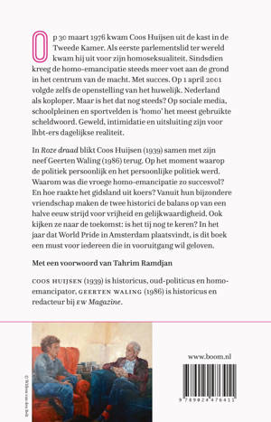 In dit boek blikt Coos Huijsen (87) samen met zijn neef Geerten Waling (39) terug. Op het moment waarop de politiek persoonlijk en het persoonlijke politiek werd. Waarom was die vroege homo-emancipatie zo succesvol? En hoe raakte het gidsland uit koers? Vanuit hun bijzondere vriendschap maken de twee historici de balans op van een halve eeuw strijd voor vrijheid en gelijkwaardigheid. Ook kijken ze naar de toekomst: is het tij nog te keren? Aan de vooravond van World Pride in Amsterdam is dit boek een must voor iedereen die in vooruitgang wil geloven.
