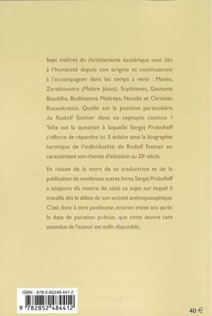 Sept maîtres du christianisme ésotérique sont liés à l’humanité depuis son origine et continueront à l’accompagner dans les temps à venir : Manès, Zarathoustra (Maître Jésus), Scythianos, Gautama Bouddha, Bodhisattva Maitreya, Novalis et Christian Rosenkreutz. Quelle est la position particulière de Rudolf Steiner dans ce septuple cosmos ? Telle est la question à laquelle Sergej Prokofieff s’efforce de répondre ici. Il éclaire ainsi la biographie karmique de l’individualité de Rudolf Steiner en caractérisant son chemin d’initiation au 20e siècle. En raison de la mort de sa traductrice et de la publication de nombreux autres livres, Sergej Prokofieff a toujours dû mettre de côté ce sujet sur lequel il travailla dès le début de son activité anthroposophique. C’est donc à titre posthume, environ treize ans après la date de parution prévue, que cette œuvre tant attendue de l’auteur est enfin disponible