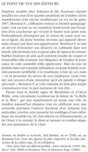Employé modèle chez Scheiner & fils, fourreurs réputés installés au coeur d'un quartier populaire de Londres où les manufactures sont encore nombreuses en cet an de grâce 1967, Monsieur F., célibataire endurci et bientôt quinquagénaire, voit un jour sa vie routinière bouleversée par l'irruption d'un cauchemar qui revient le hanter nuit après nuit. Profondément désemparé par la vision du corps sans vie, nu et ligoté, du jeune homme inconnu qui apparaît désormais chaque soir dans son appartement, Monsieur F. se met en devoir d'exorciser son désarroi en s'abîmant dans son travail, sélectionnant avec toujours plus de rigueur les innombrables fourrures de prix qu'il convient ensuite de couper et d'assembler afin d'assurer aux élégantes de Londres la jouissance de cette animalité enfin apprivoisée. Mais du jour où pénètre dans son royaume industrieux un jeune homme scandaleusement semblable à la troublante icône de ses nuits - en la personne du neveu de son employeur, venu s'initier aux arcanes d'une entreprise qu'il est appelé à diriger plus tard -, Monsieur F. se voit contraint de faire plus ample connaissance avec la part nocturne de son être... Placée sous le double signe de Baudelaire et d'Oscar Wilde, cette envoûtante variation sur le thème de "la Belle et la Bête", qui met superbement en scène une ville de Londres aujourd'hui disparue tout en célébrant avec une sensuelle précision l'univers fascinant d'un artisanat très particulier, réactive avec panache les sortilèges d'une esthétique du sensible où, de clair-obscur en éblouissements, et de l'émoi à la cruauté, le désir se mesure en combat singulier aux puissances de la chair.