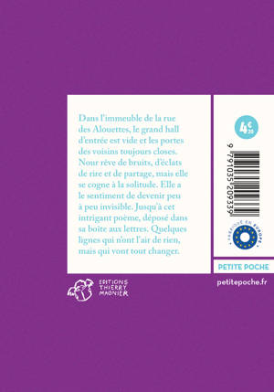 Dans l'immeuble de la rue des Alouettes, le grand hall d'entrée est vide et les portes des voisins toujours closes. Nour rêve de bruits, d'éclats de rire et de partage, mais elle se cogne à la solitude. Elle a le sentiment de devenir peu à peu invisible. Jusqu'à cet intrigant poème, déposé dans sa boîte aux lettres. Quelques lignes qui n'ont l'air de rien, mais qui vont tout changer.