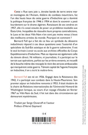 Cette Rue sans joie , etroite bande de terre entre mer et montagnes de l'Annam, theatre de combats meurtriers, fut l'un des hauts lieux de cette guerre d'Indochine qui a domine la politique francaise de 1946 a 1954 et dont le souvenir a pese lourdement sur le drame algerien. Renaissant de ses cendres en 1957, elle n'a cesse ensuite de poser un probleme insoluble aux Etats-Unis. Incapables de resoudre leurs propres contradictions, le Laos et les deux Viet-Nam n'en sont pas moins venus a bout des meilleures armees du monde. Pourquoi et comment ? Bernard Fall qui a fait de ce lieu un symbole du desastre indochinois repond a ces deux questions avec l'autorite d'un specialiste du Sud-Est asiatique et de la guerre subversive. Il est le seul ecrivain a avoir eu acces aux archives officielles du Corps Expeditionnaire d'Indochine. Mais sa reponse est egalement celle du temoin direct. Ni militaire, ni journaliste, il a participe sur le terrain aux operations, parfois sur les arrieres ennemis, et recueilli de la bouche meme des rescapes le recit des atroces embuscades qui marquerent cette guerre. Temoin capital de l'agonie francaise en Indochine, il en a ecrit le maitre-livre.