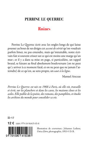 Ce livre est une fausse biographie de l'artiste et poète Unica Zürn, sous forme de poème. Extrait de la postface de Manuel Anceau : « Perrine Le Querrec écrit avec les ongles longs de qui laisse pousser au bout de ses doigts cet accent de vérité qu'on voudrait parfois limer, ne pas entendre, mais qu'intraitable, notre écrivain fait si souvent crisser sur ce qui est moins une marge qu'un mur?; et il y a dans sa mise en page, si particulière, un rappel brutal, se faisant au final absolument bouleversant (on ne peut qu'y arriver à ce moment fatal, et on ne peut que ne jamais l'atteindre) de ce qu'est, au sens propre, un saut à la ligne. » Ce livre a bénéficié d'une vingtaine de critiques positives.