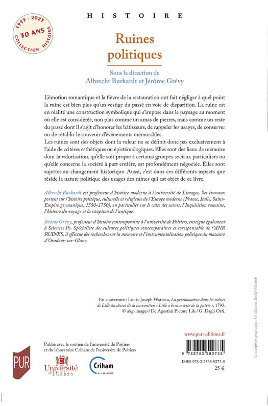 L’émotion romantique et la fièvre de la restauration ont fait négliger à quel point la ruine est bien plus qu’un vestige du passé en voie de disparition. La ruine est en réalité une construction symbolique qui s’impose dans le paysage au moment où elle est considérée, non plus comme un amas de pierres, mais comme un reste du passé dont il s’agit d’honorer les bâtisseurs, de rappeler les usages, de conserver ou de rétablir le souvenir d’événements mémorables.