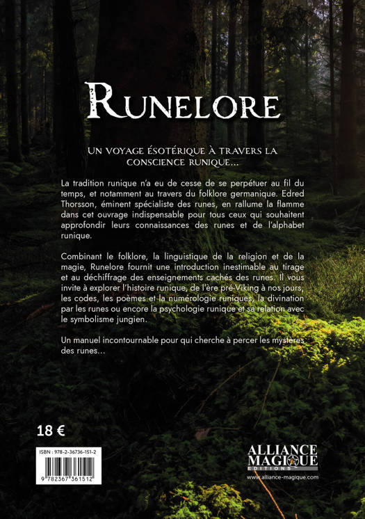 Nul doute que les runes, langage symbolicomagique des anciens Nordiques, ont encore beaucoup de secrets à révéler et de chemins à indiquer à ceux qui les explorent. Edred Thorsson, spécialiste mondial des runes et de la magie runique, aide ainsi le lecteur à appréhender leur sagesse. « Runelore » est l’un des textes majeurs consacré à la dimension théorique et ésotérique de la runologie. Dans la première partie intitulée « Le savoir historique », Edred Thorsson s’appuie sur des découvertes archéologiques pour expliquer l’origine des runes, leur signification et la manière dont elles ont évolué. Dans la deuxième partie intitulée « Le savoir caché », il adopte une approche plus psychologique des runes et se penche sur la cosmologie afin d’expliquer le rôle joué par les runes et la façon dont elles ont été utilisées au fil du temps. Mêlant folklore, histoire, linguistique, numérologie et psychologie, l’auteur dresse, dans ce manuel indispensable, un portrait complet des runes et de leurs codes cachés.