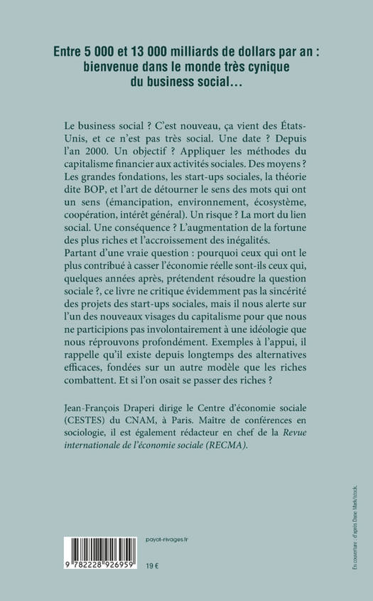 Entre 5 000 et 13 000 milliards de dollars par an : bienvenue dans le monde très cynique du business social... Le business social ? C'est nouveau, ça vient des États-Unis, et ce n'est pas très social. Une date ? Depuis l'an 2000. Un objectif ? Appliquer les méthodes du capitalisme financier aux activités sociales. Des moyens ? Les grandes fondations, les start-ups sociales, la théorie dite BOP, et l'art de détourner le sens des mots qui ont un sens (émancipation, environnement, écosystème, coopération, intérêt général). Un risque ? La mort du lien social. Une conséquence ? L'augmentation de la fortune des plus riches et l'accroissement des inégalités.