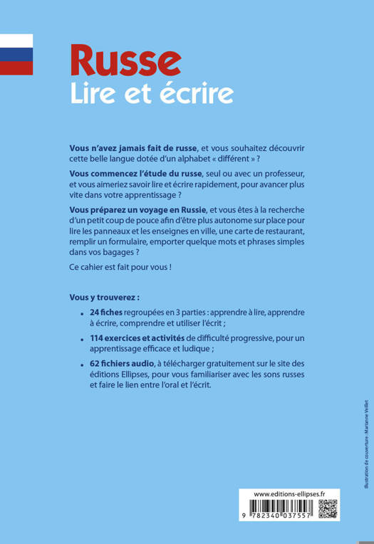Idéal pour les débutants, cet ouvrage accompagne le lecteur pas à pas dans sa découverte de l’alphabet russe et dans l’apprentissage de la lecture et de l’écriture. Illustré, bicolore et comprenant des fichiers audio, il permet de s’initier et de progresseravec méthode, à son rythme, et d’acquérir les premières clés pour être plus autonome en Russie (lire des panneaux dans la rue, une carte au restaurant, remplir un formulaire, …).